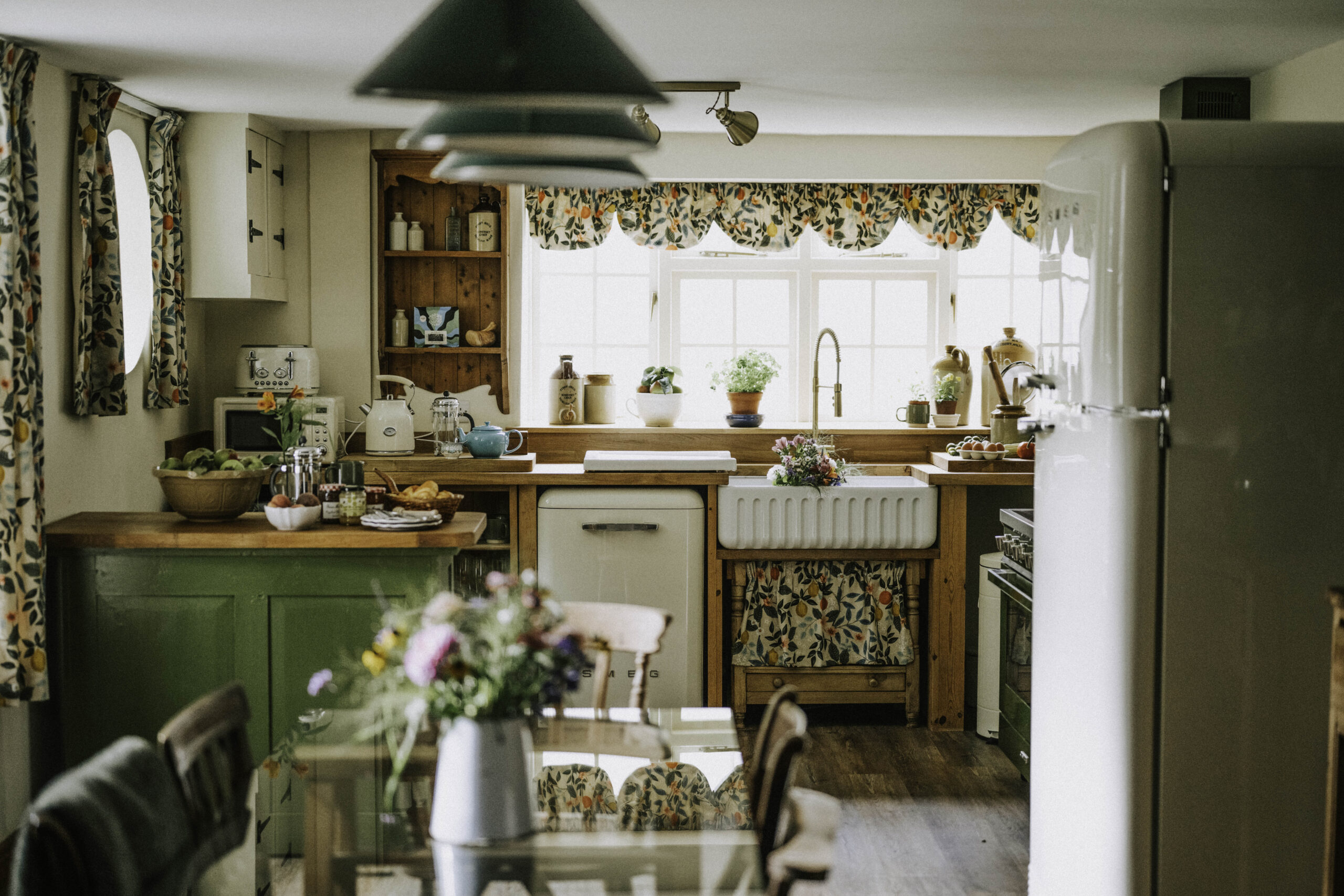 Large kitchen with a huge dresser, lots of cookery books and a butlers sink.