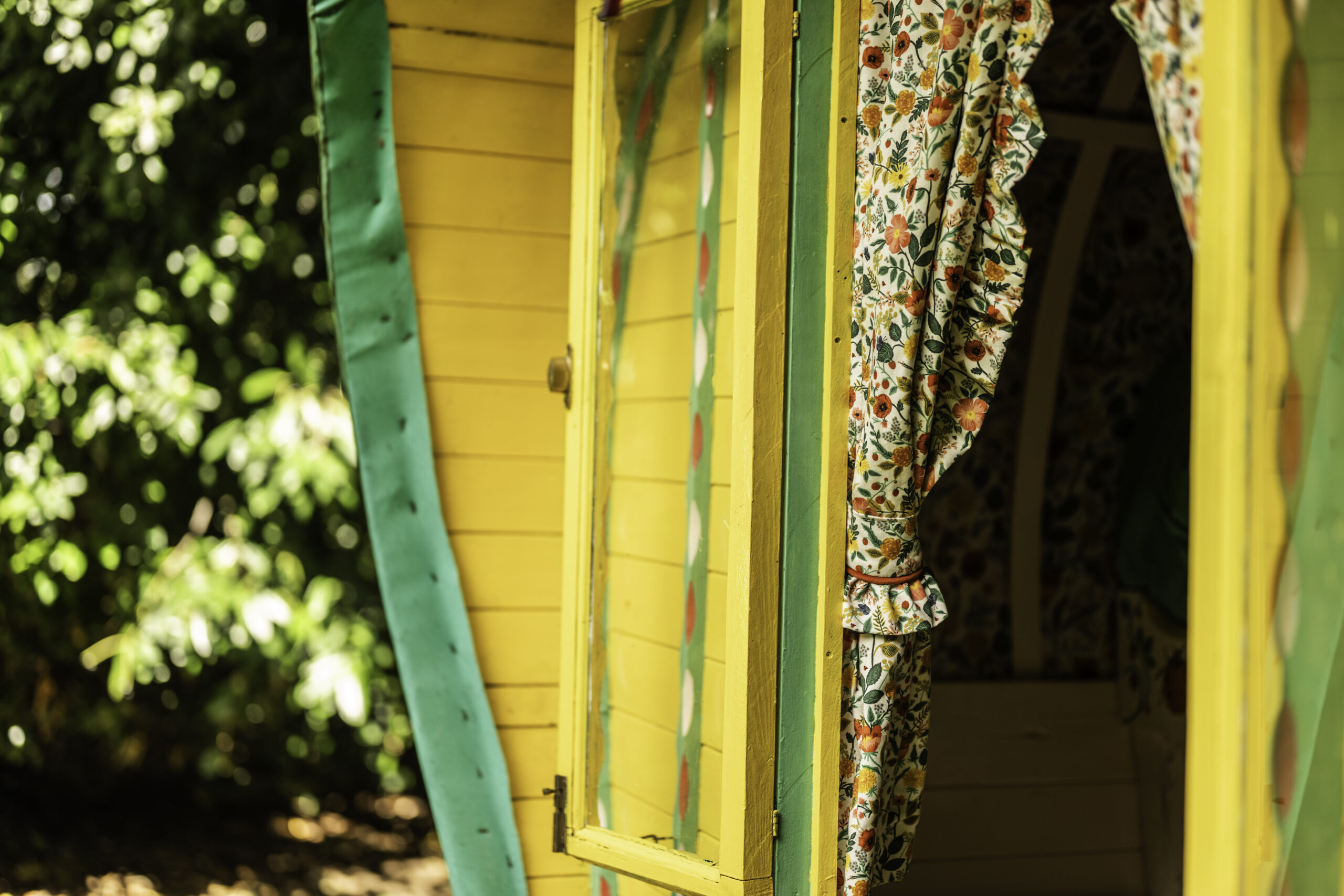 Our beautiful wagon is sunshine yellow with handprinted details. The curtains and ceiling are a delightful floral fabric by The Rifle Paper Co. There is a double bed with proper mattress up on a platform. Space underneath for a floor bed for children.
