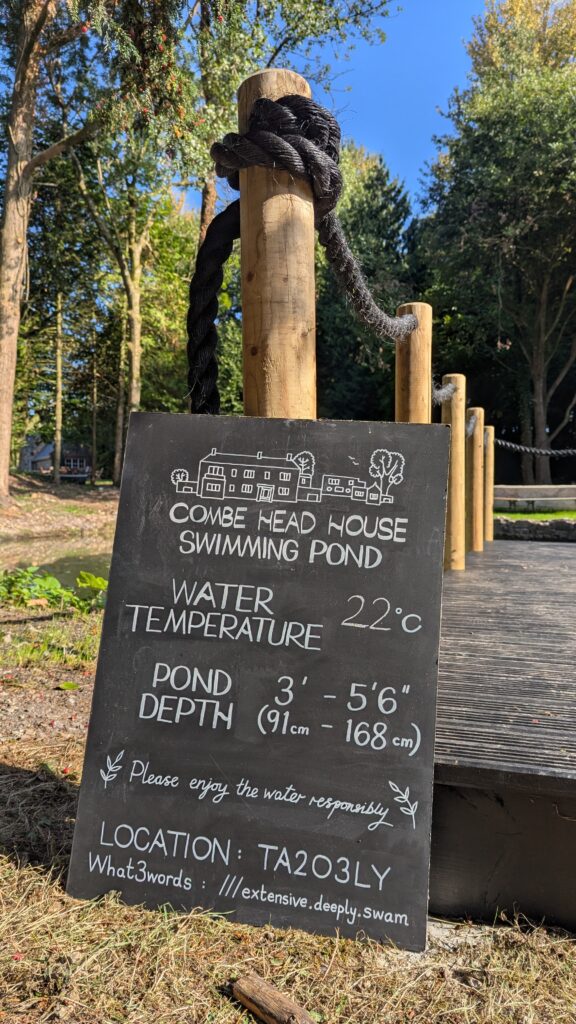 Wild swimming at Combe Head House offers a peaceful, revitalising way to connect with nature. Our swimming pond is fed by spring water and is surrounded by mature trees, wildlife, and open sky, creating a calm and grounding environment that invites you to slow down, breathe deeply, and enjoy the simple pleasure of cold, clear water.